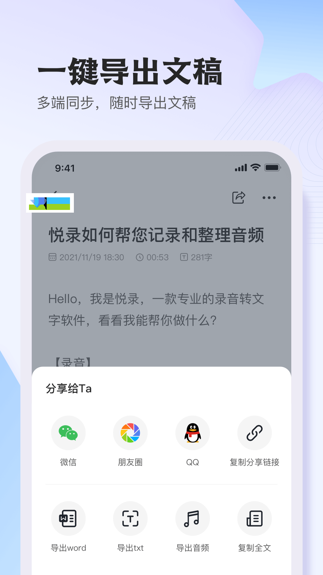 悦录是集语音转文字工具、视频转字幕工具以及随身语音笔记一体的APP,能将会议、访谈、讲座等重要场合的录音文件通过AI生成文稿一并保存,还能将知识音频、有声书、音乐等学习或娱乐音频材料也纳入其中;同时可以作为口袋笔记随手记录,享受便捷高效的AI服务,感受闻其声也能见其字的产品新体验。