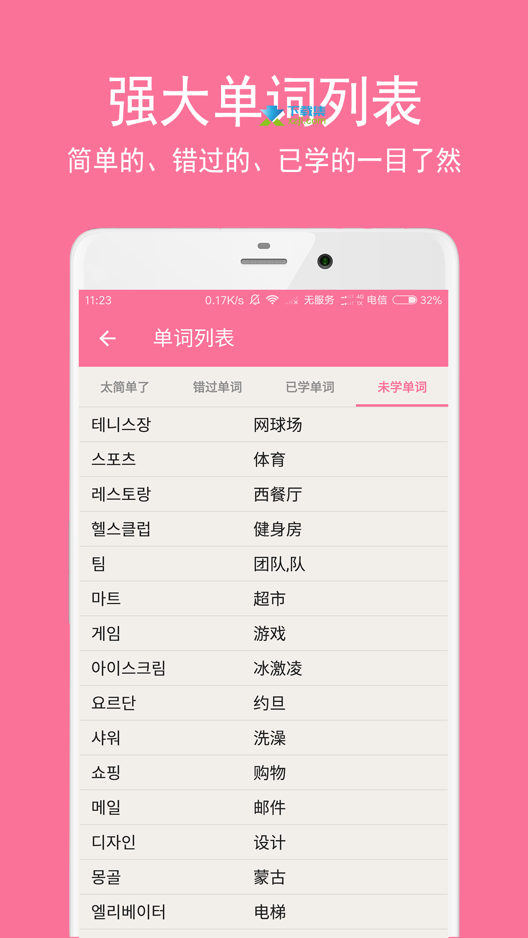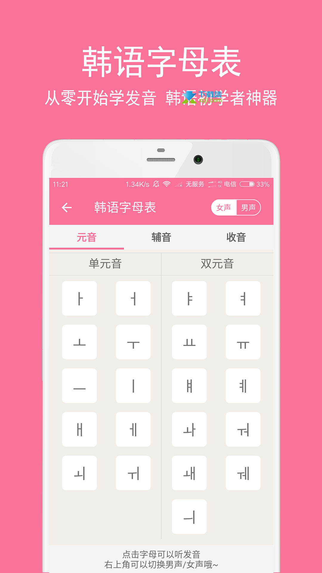 零基础快速学韩语。超强韩语字母表,让初学者快速入门。全新的科学计划背单词,以及使用记忆遗忘曲线安排复习,让你的韩语水平突飞猛进。