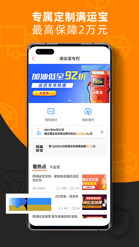 √满运宝:调车更快、开专用发票(物流企业专享)、免费TMS系统(物流企业专享)、API数据同步(物流企业专享)、专属客服、享货运保障:免费提供货运(货损、延误、加价)保障,货损报损金额5000元以内的更有可能享受2小时内闪赔。