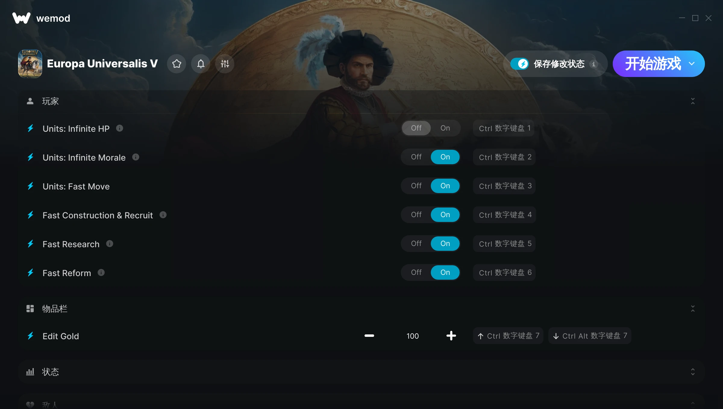 欧陆风云5 WeMod修改器(Europa Universalis V),内置33项功能,包含无限士气、无限影响力、无限金币等,玩家可以免费下载使用。