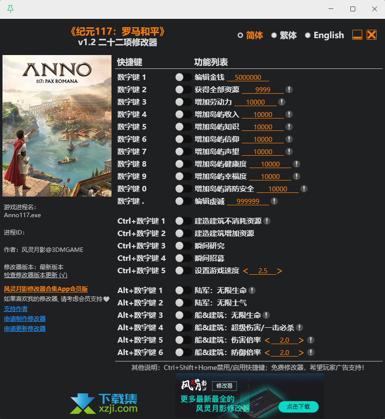 纪元117罗马和平修改器(Anno 117 Pax Romana),内置22项功能,包含金钱编辑、无限生命、无限士气等,玩家可以免费下载使用。