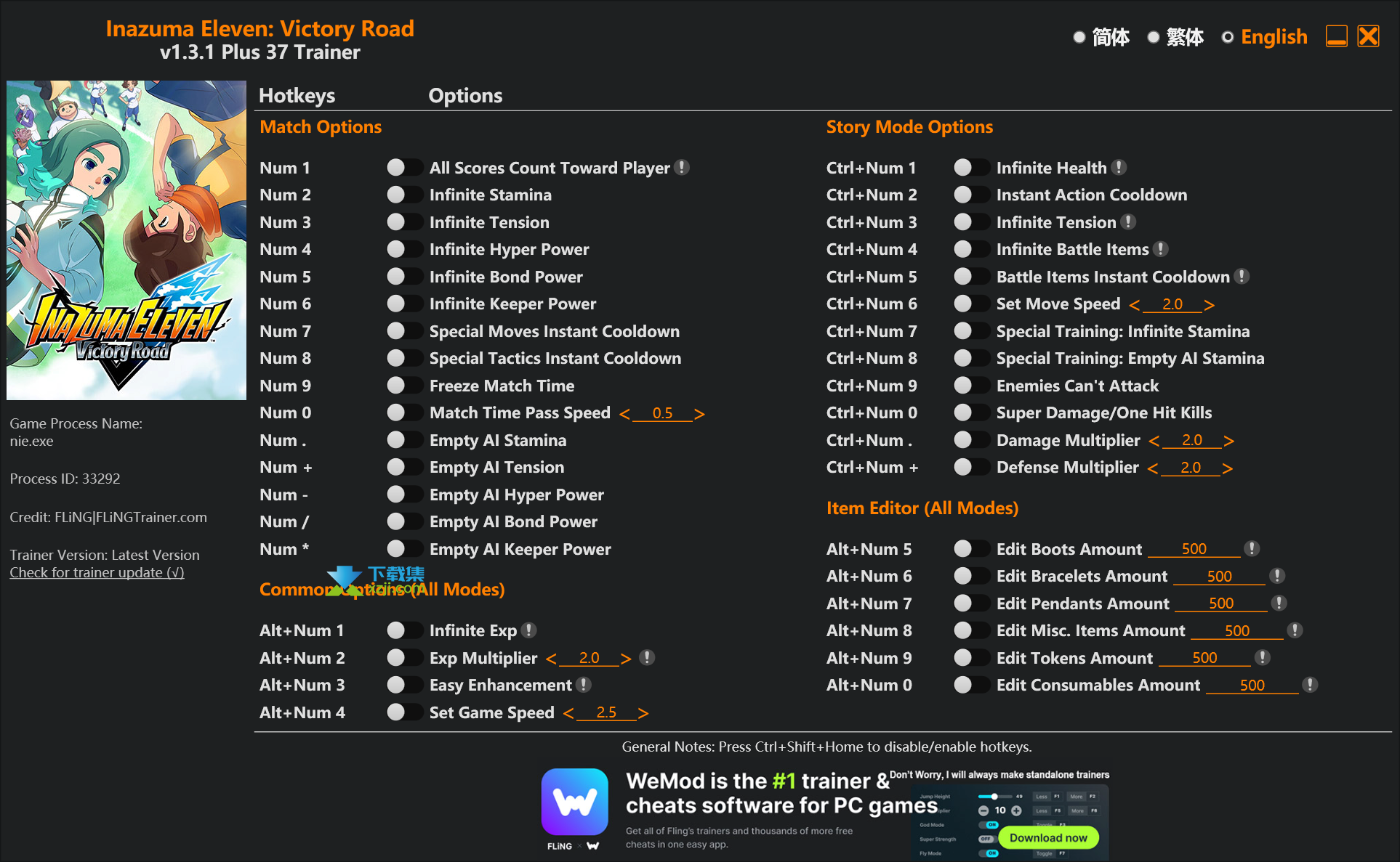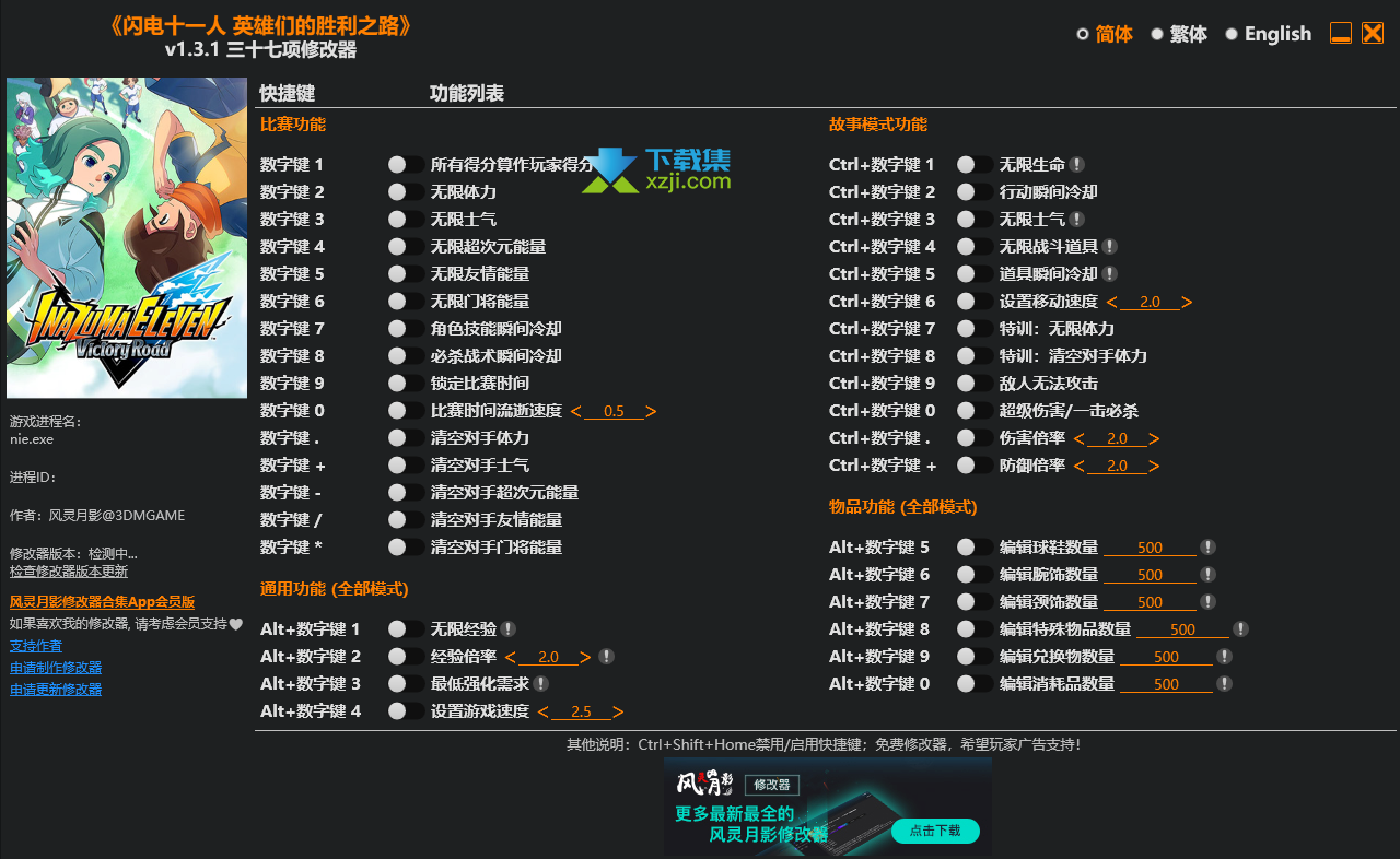 闪电十一人英雄们的胜利之路修改器,内置37项功能,包含无限体力、无限士气、无限经验等,玩家可以免费下载使用。