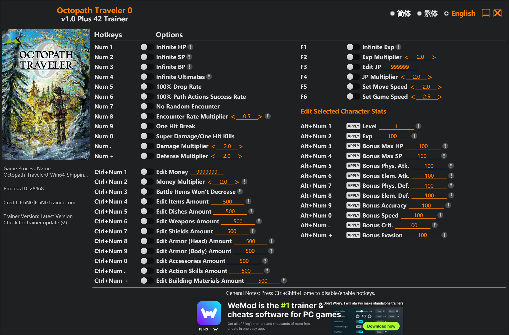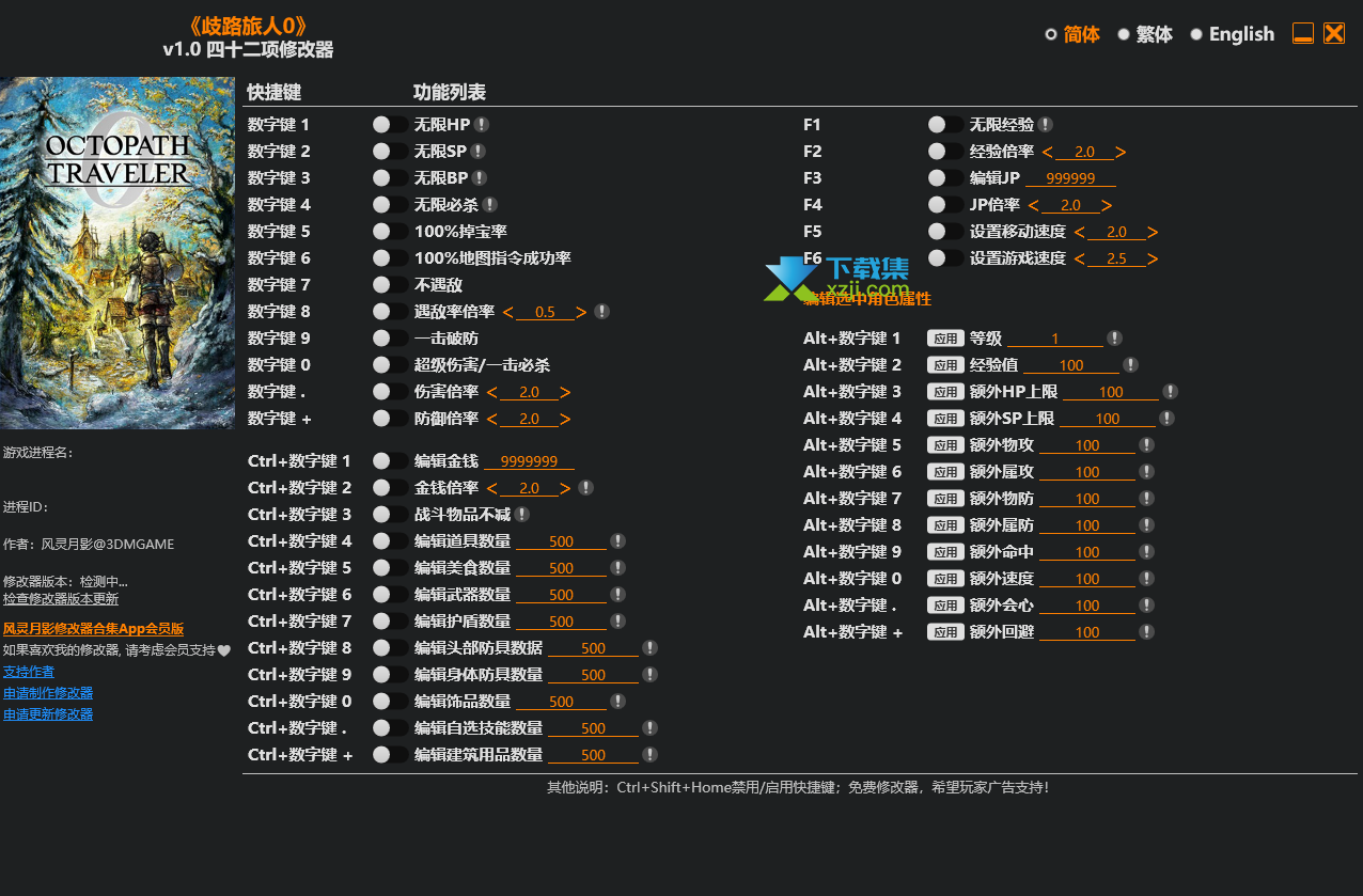 歧路旅人0修改器(octopath traveler 0),内置42项功能,包含无限HP、SP、BP、无限必杀等,玩家下载后,可以免费使用所有功能。
