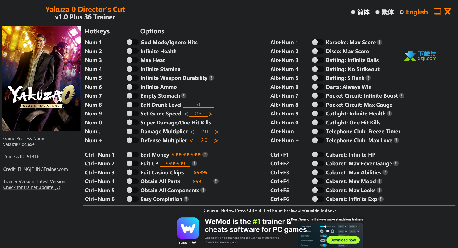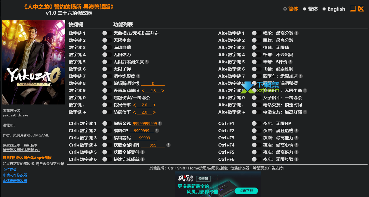 人中之龙0誓约的场所导演剪辑版修改器(Yakuza 0 Directors Cut),内置36项功能,包含无限生命、无限体力等,玩家可以免费下载使用。