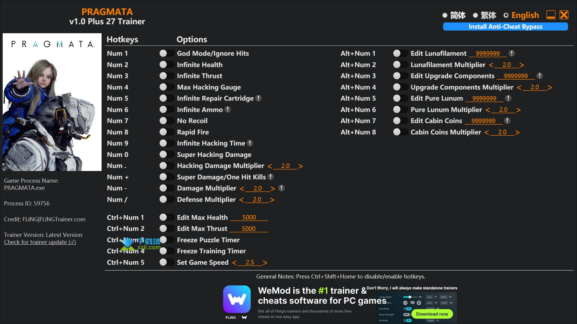 识质存在修改器PRAGMATA,包含27项功能,如无限生命、无限推进力、无限子弹等,玩家下载后,可以免费使用所有功能。