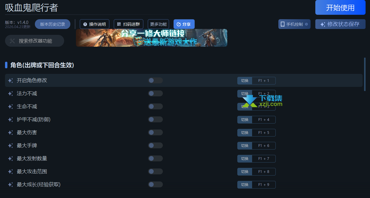 吸血鬼爬行者一修大师修改器,内置了31项修改功能,包含法力不减、生命不减、护甲不减等,玩家可以免费下载使用。