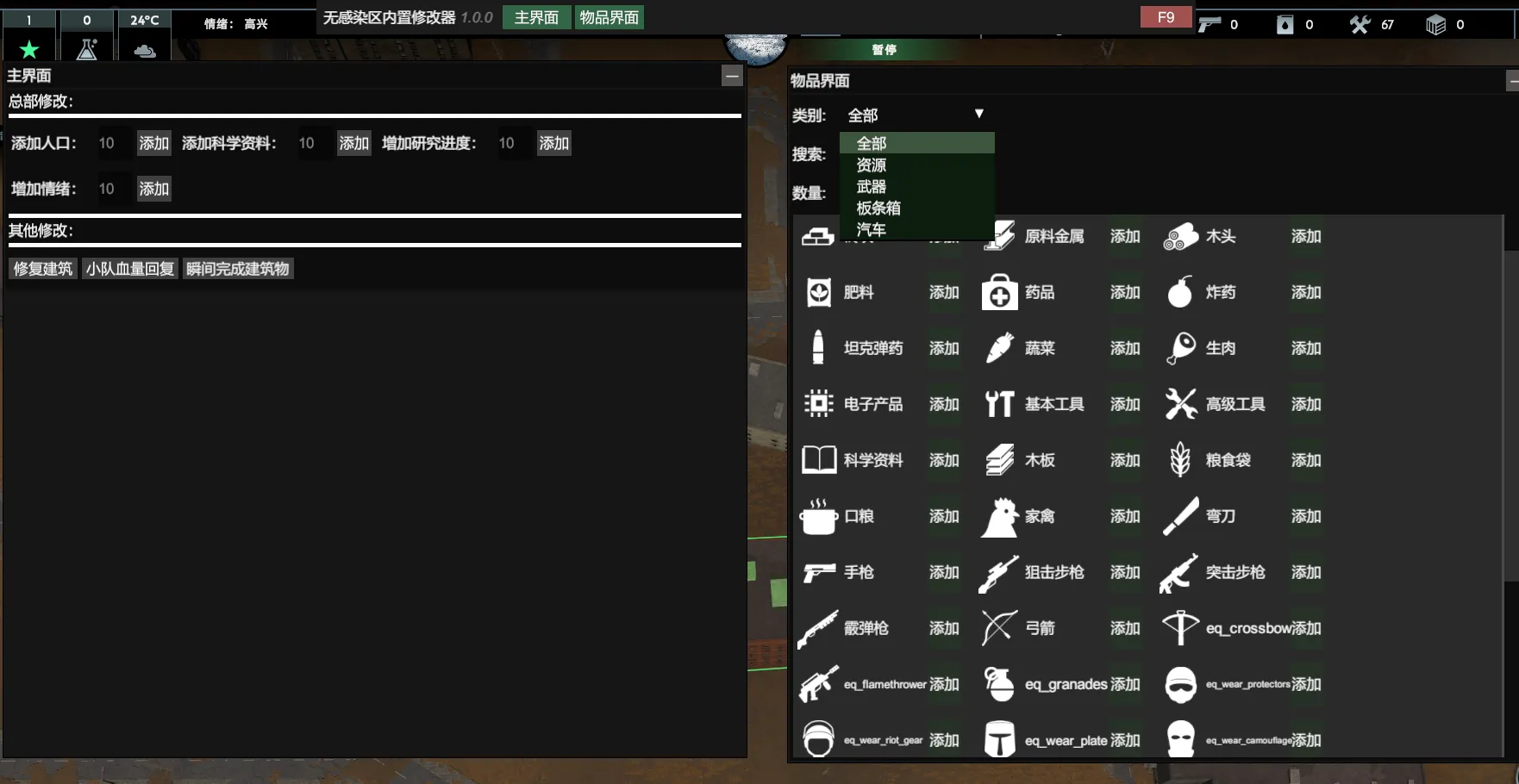 无感染区(Infection Free Zone)内置修改器,具有人口添加、科技修改、车辆添加等修改功能,使用后可以帮助玩家快速升级。