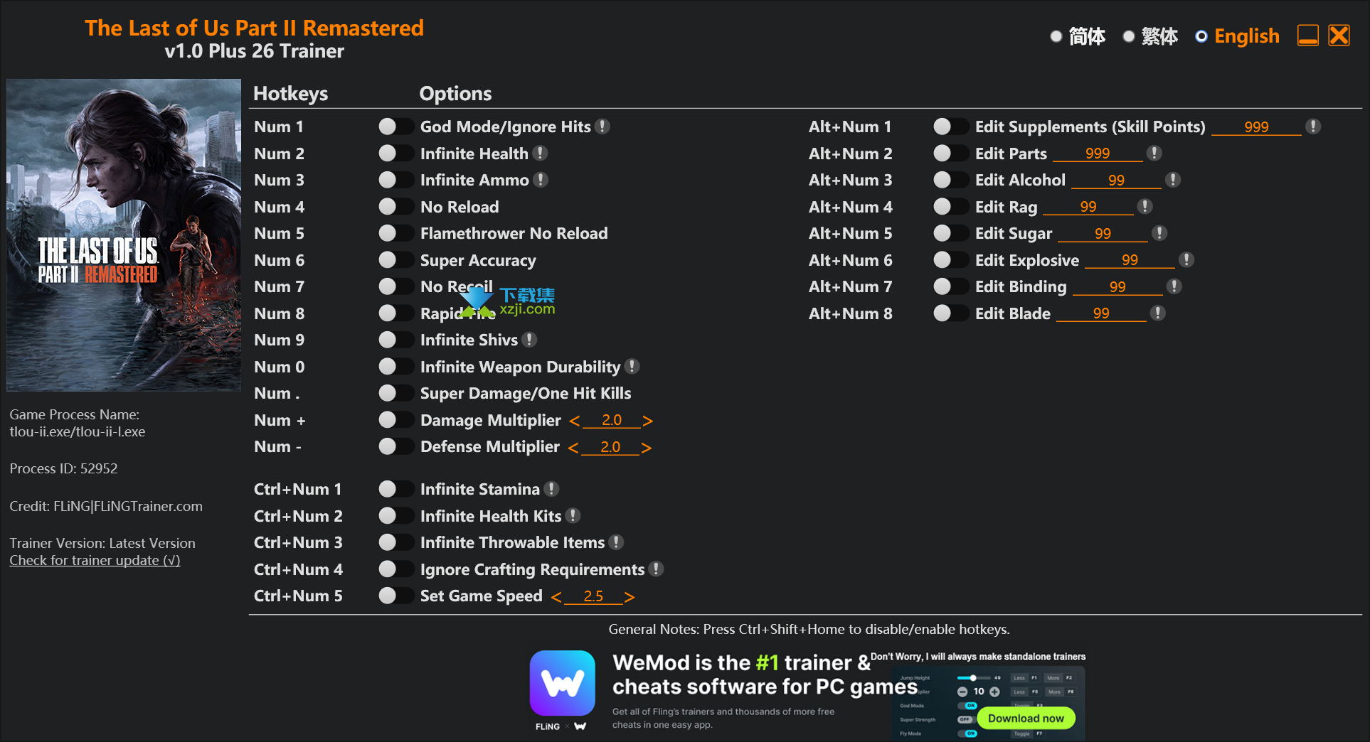 最后的生还者2重制版修改器The Last of Us Part II Remastered,具有无限生命、无限子弹等修改功能,使用后可以帮助玩家升级,用户免费下载。