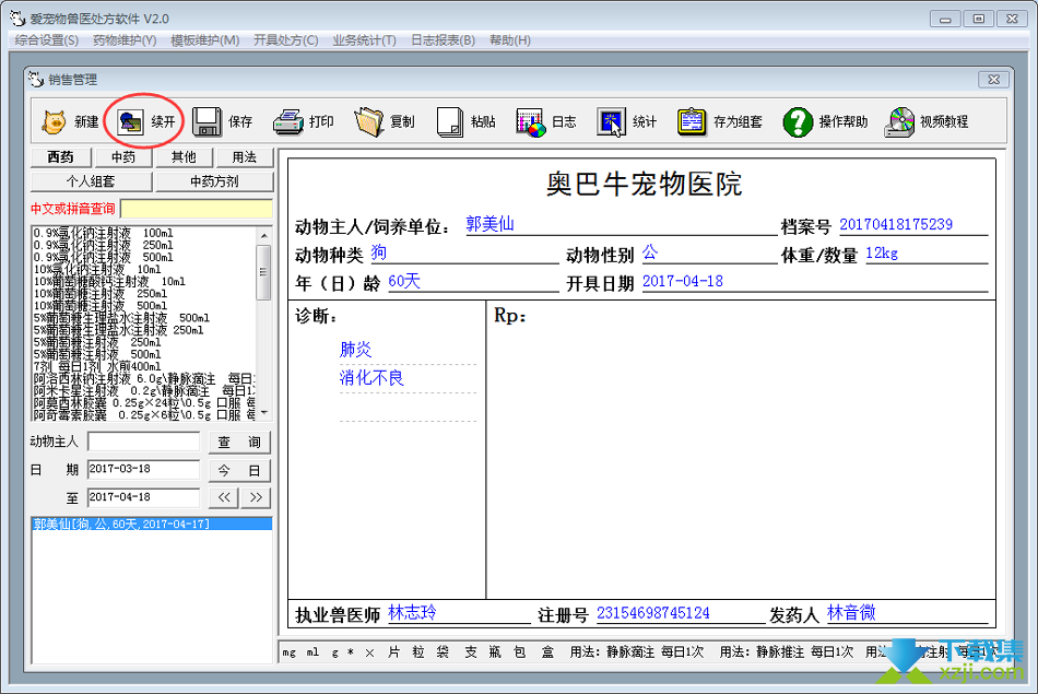 如果处方药物较多,一张处方开不下,这时,你可以点“续开”按钮继续开第二张处方,不必再次输入“动物主人”、“动物名称”等一般项目 。