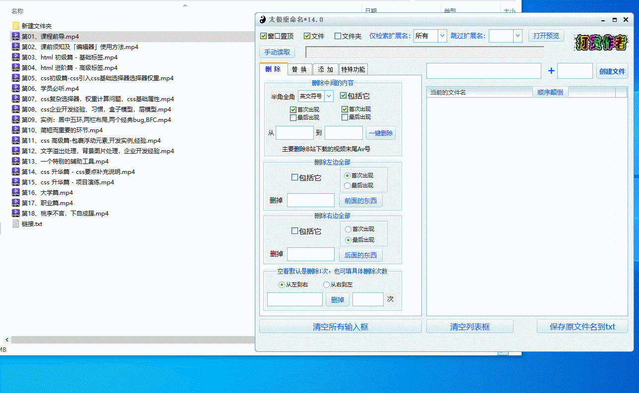 太极重命名是一款文件批量改名、批量重命名软件。满足所有修改文件、文件夹名字的要求,重命名操作支持文件夹、文本、图片、音乐、视频、pdf、Office文档、rar、zip、7z等压缩包,修改文件支持实时预览功能。