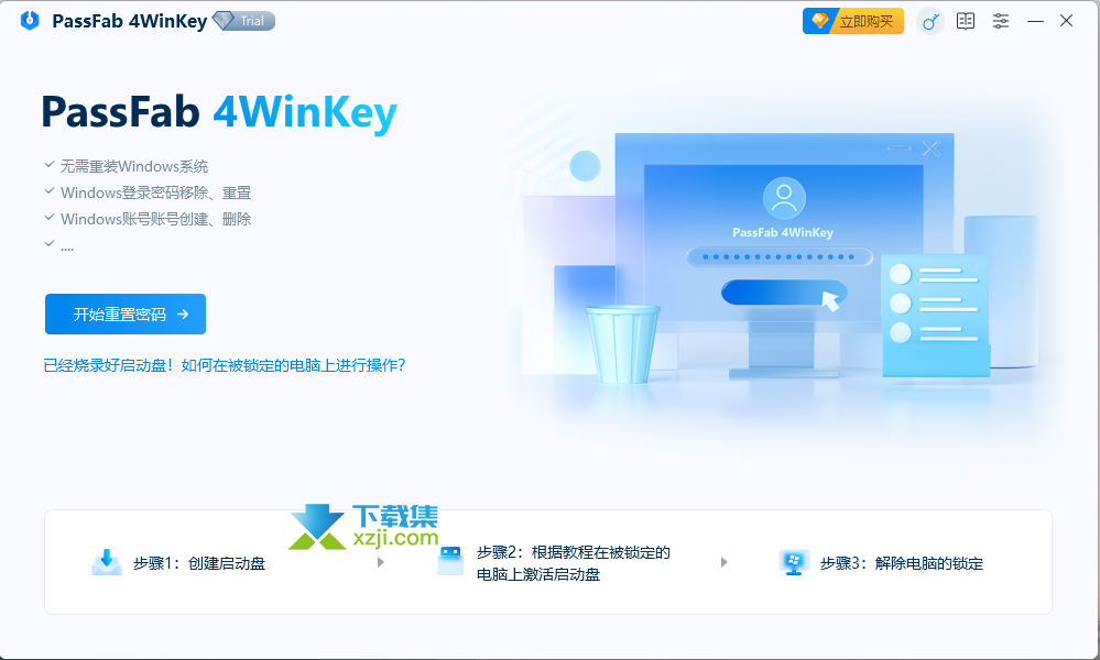 PassFab 4WinKey是一款实用的 Windows 密码恢复工具,可帮助您解决忘记 Windows 密码无法登录的问题。该工具支持 Windows 11/10/8.1/8/7/Vista/XP/2000/Server 等操作系统,只需三个步骤即可完成密码恢复。