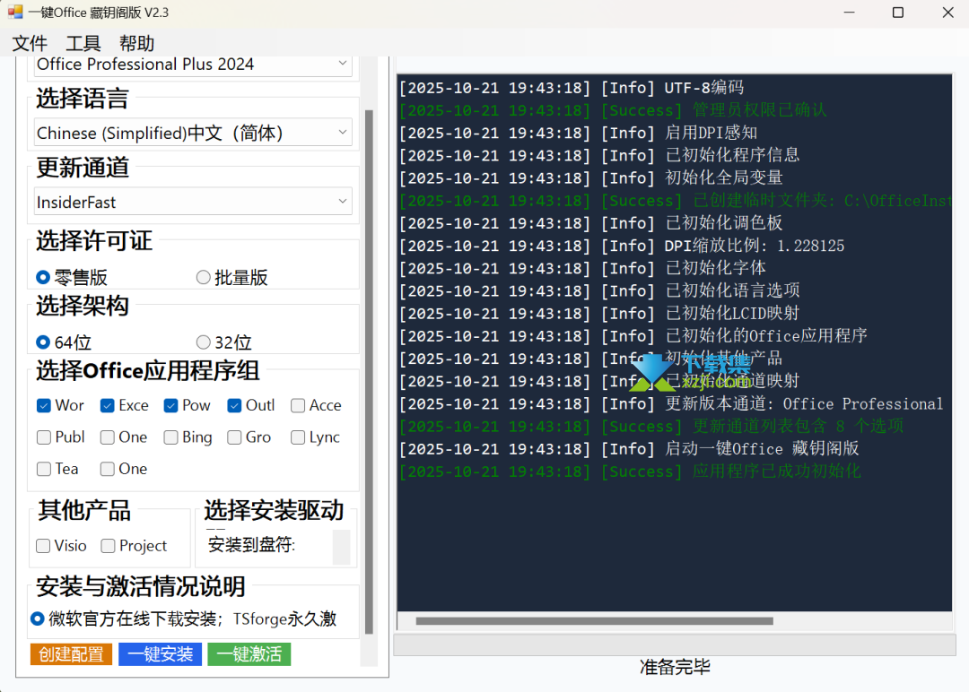 该工具基于微软官方Office部署工具(ODT),在线下载安装Office组件,确保版本的纯净与官方一致性。激活方面,软件集成稳定的TSForge激活机制,通过ZeroCID配合微软官方电话激活流程,兼顾安全与实用性。整个过程无需额外操作,真正实现一键部署一键激活,大大简化传统安装步骤,是办公环境快速构建的高效解决方案。