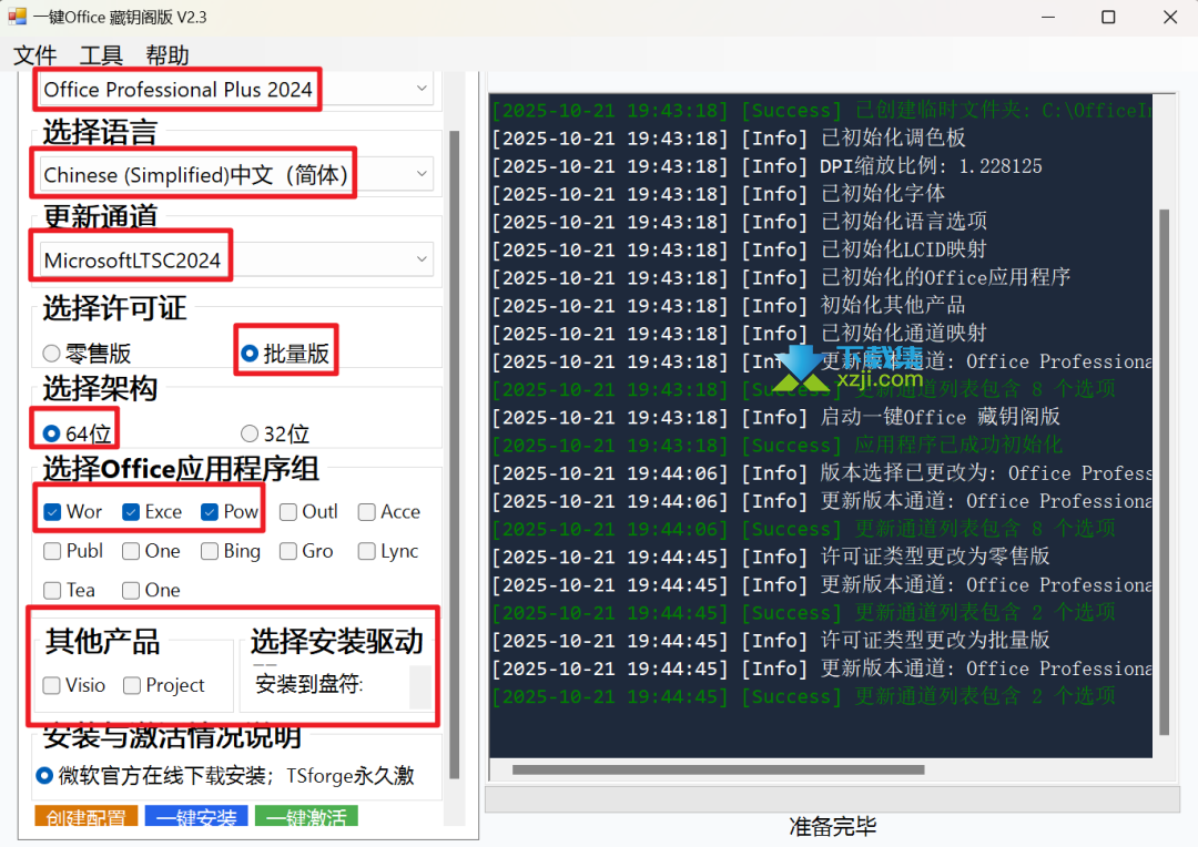 一键Office 藏钥阁版是一款集成度极高的办公软件部署工具,支持一键安装与激活,操作简洁,极其适合新手用户。软件为绿色单文件版,无需复杂安装流程,双击即开。用户可根据自身需求,自由选择Office版本、语言、更新通道、许可证类型及系统架构,同时还支持安装扩展组件如Visio与Project。值得一提的是,软件允许用户自行选择安装目录,突破只能安装在系统盘的限制,灵活度更高。