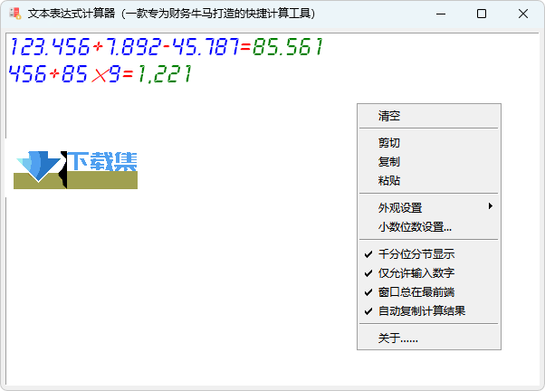 除了基础计算,它还加入了不少贴近日常办公习惯的细节功能。比如支持自定义字体和颜色,方便用户调整更舒服的显示效果;支持小数位数和舍入方式设置,能更好适应财务核算中对精度和取整规则的要求;计算结果还能自动复制到剪贴板,算完即可直接粘贴到 Excel、表格或凭证中,省去重复复制的步骤。